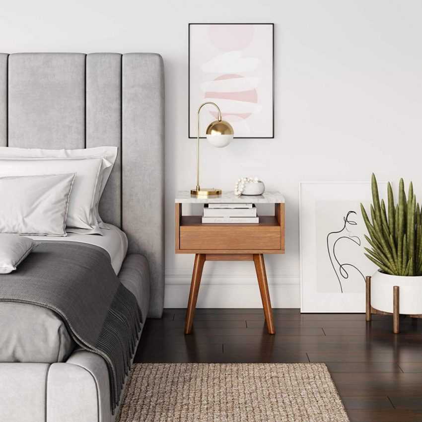 Посмотрите на отделку вашей нынешней мебели. Вы хотите разнообразие и баланс в пространстве. Если ваша мебель из темного дерева, подумайте о другом материале для вашего прикроватного столика.