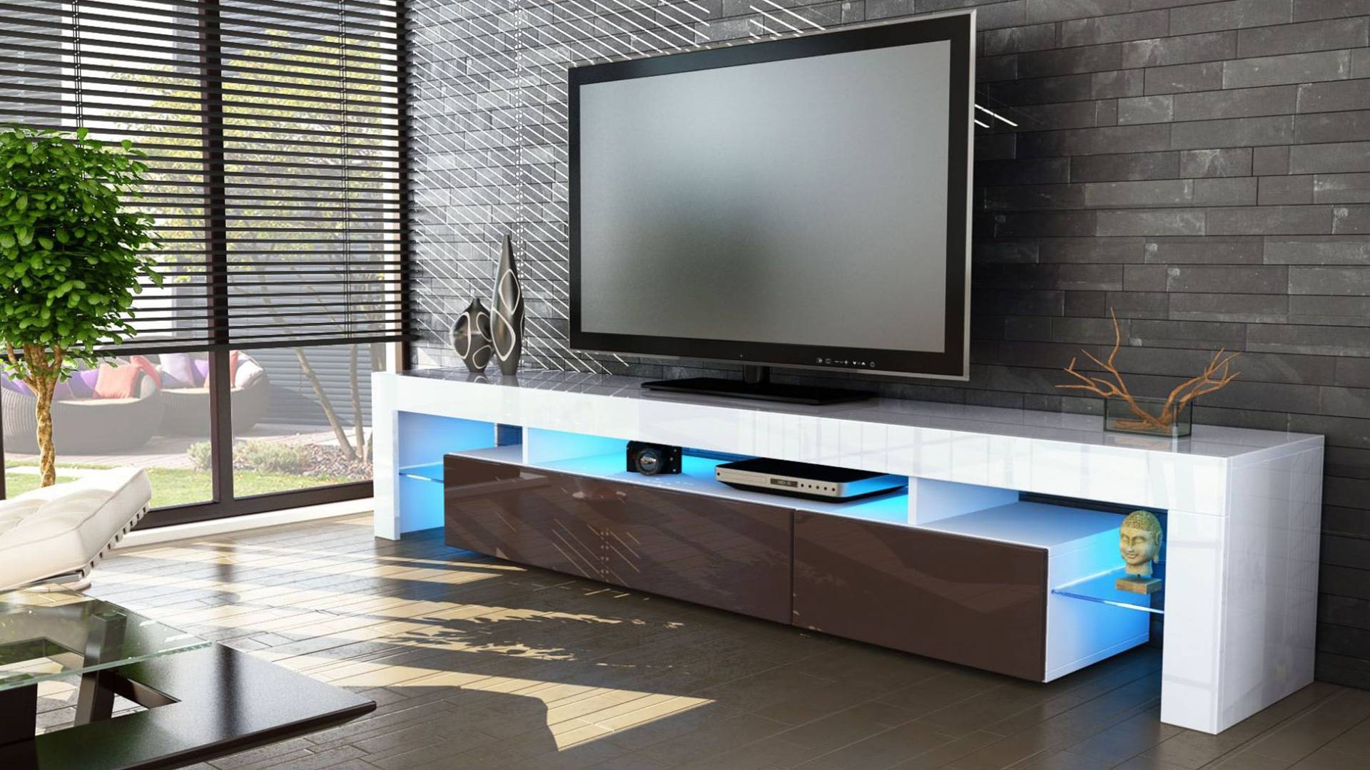 - удачно подобранная мебель под телевизор подчёркивает эффектность телевизионной техники, дополняя модный интерьер помещения;