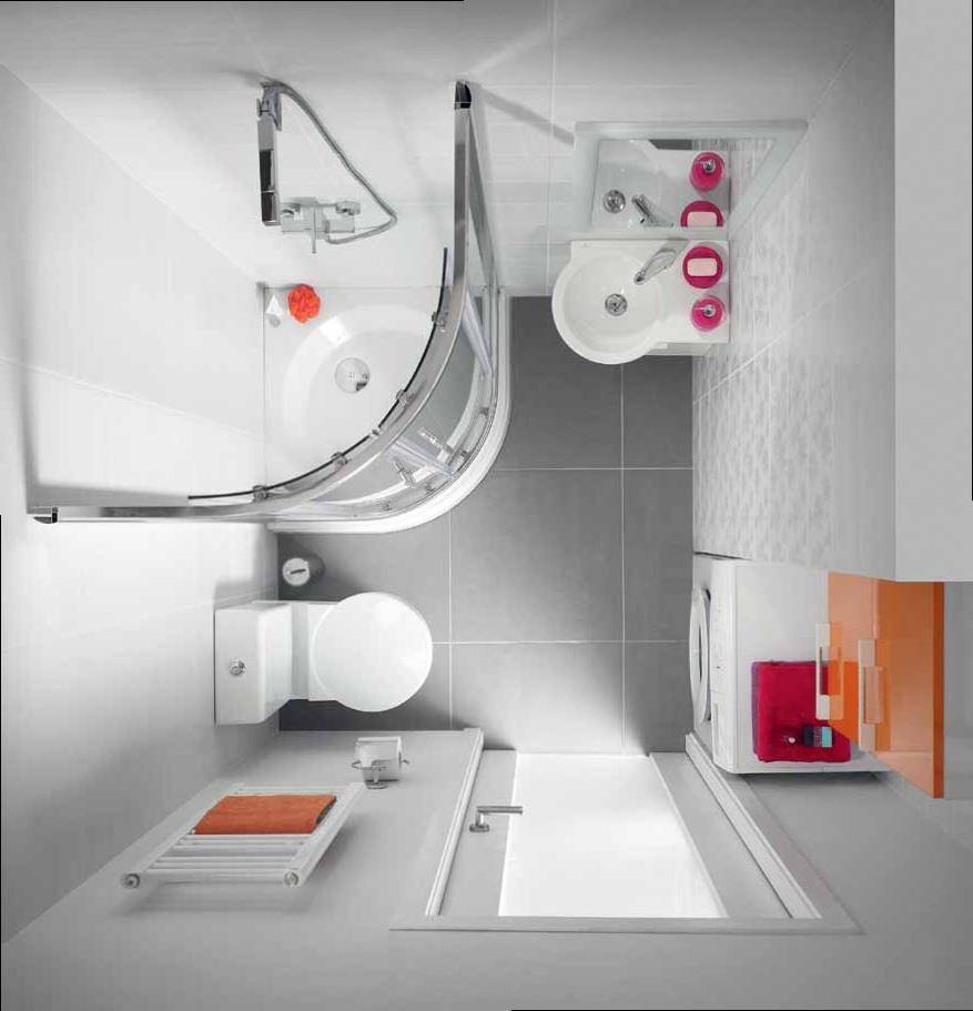 Если площадь помещения небольшая, то вместо габаритной ванны желательнее монтировать в нем душевую кабину. Она займет меньше пространства, но при этом отлично будет справляться со своей функцией. Особенно актуальны для таких помещений угловые типы душевых кабин. Если же вы все-таки решили установить ванну, то можно ее разместить у стены напротив входа, а остальные элементы вмонтировать по одной боковой стороне. В этом случае необходимость разводить в разные стороны коммуникации исчезает. Кроме того, есть модели угловых ванн, которые в какой-то степени экономят пространство и делают помещение эргономичным.