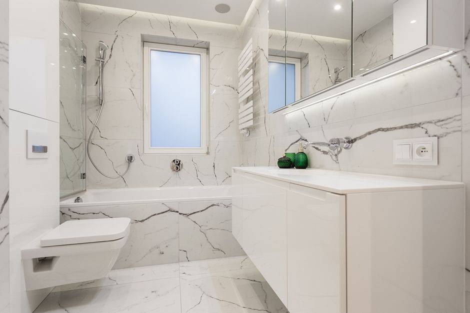 Обустройство маленькой ванной комнаты из мрамора