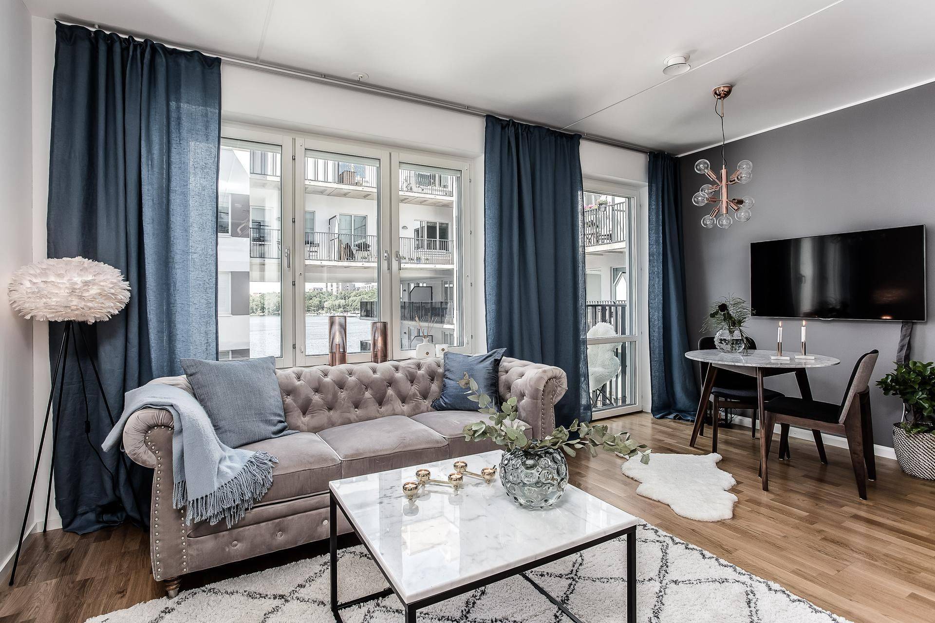 Лидирующие цвета в этом стиле – белый и серый с вкраплением оттенков натуральной древесины. Пространство не загромождено мебелью. Материал обивки представлен в светлой палитре и лишен сложных рисунков.