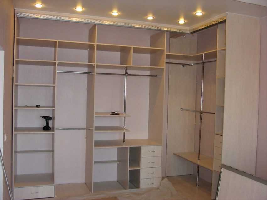 Угловой шкаф обязан вмещать большое количество вещей. Поэтому его обычно оснащают множеством разнокалиберных внутренних ящиков. Стандартный шифоньер должен иметь: