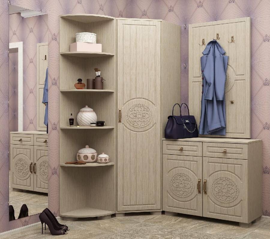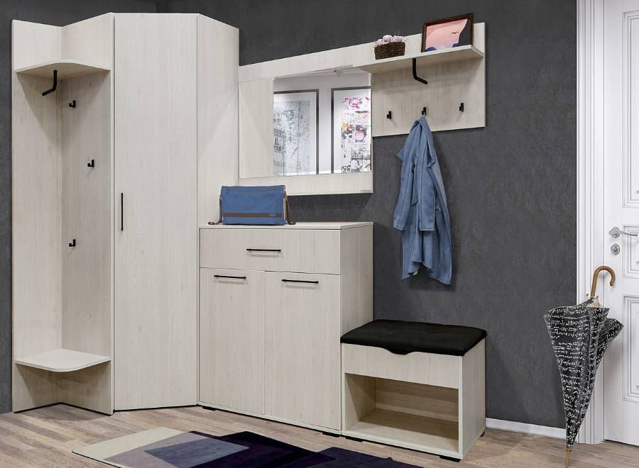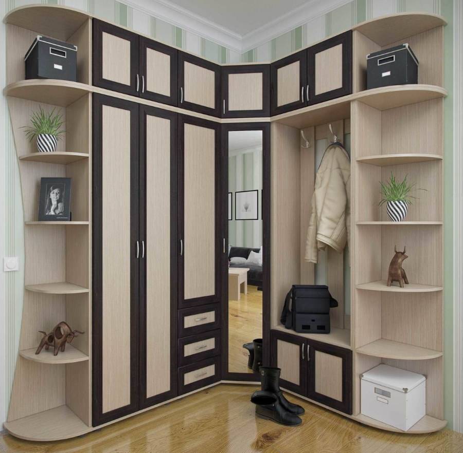 Прихожая, занимающая один из углов – распространенный вариант меблировки. Благодаря такой мебели помещение становится уютным. Оптимальный вариант для малогабаритной квартиры мебель симметричной формы, шкафы и закругленными краями. Практичные открытые конструкции смотрятся современно.