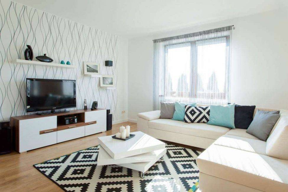 - Минимализм. Для данного стиля главным принципом выступает максимальное сохранение свободного пространства за счет минимального количества предметов мебели и интерьера. Характерными цветами колорита гостиной являются белый, черный, серый и красный цвет. Контрастное сочетание цветов делает интерьер динамичным и легко воспринимаемым. Еще одна особенность данного стиля – наличие мебели, имеющей прямые углы: квадратные кресла, прямоугольный диван, такой же формы стол, можно разместить навесные шкафы с глянцевыми поверхностями, но так чтобы они не загромождали пространство.
