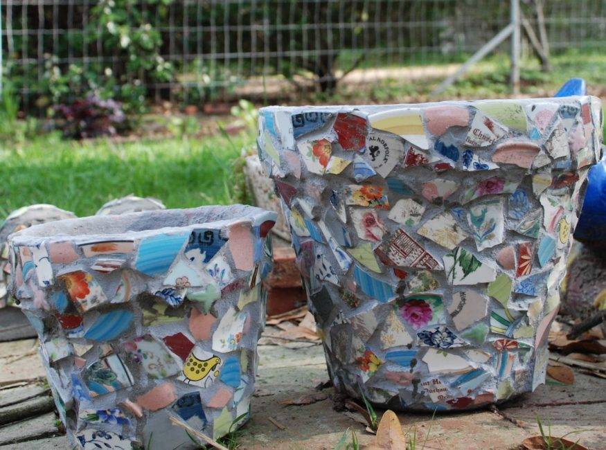 Для творчества подойдет битая столовая утварь, дырявое старое ведро.