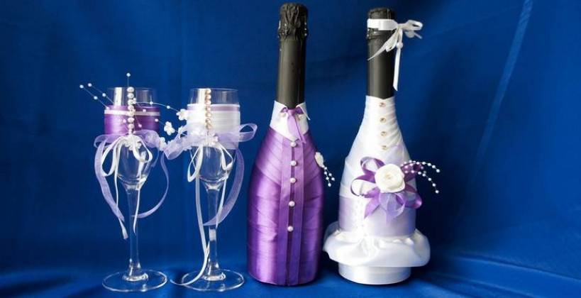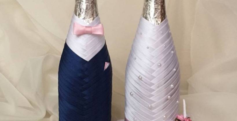 Самым простым способом украсить бутылки шампанского является обмотка их атласными лентами. Для этого не надо специальных знаний или умений – достаточно выбранного материала, немного фантазии и нескольких часов свободного времени.