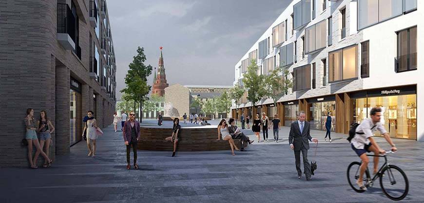 Под благоустройство и озеленение в UP-квартале отдана треть территории (почти 8 га). Как уже было сказано выше, деловую и жилую зоны разделили по уровням: верхний – в распоряжении жителей и пешеходов, там разместят игровые и спортивные площадки, зоны отдыха, прогулочные дорожки. На нижнем же сосредоточится вся инфраструктура.