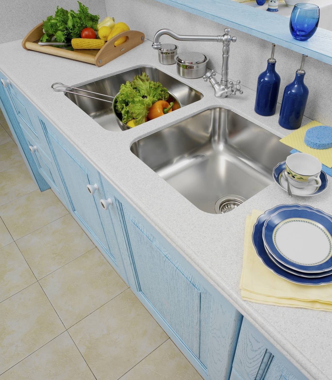 Оно приятно освежает даже в самый жаркий день, что в случае кухни, немаловажно. Для жизнерадостного и домашнего стиля кантри традиционным считается сочетание соломенно-желтого и василькового