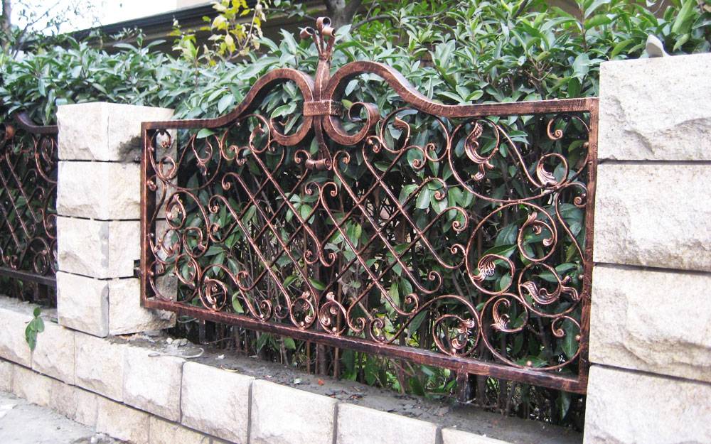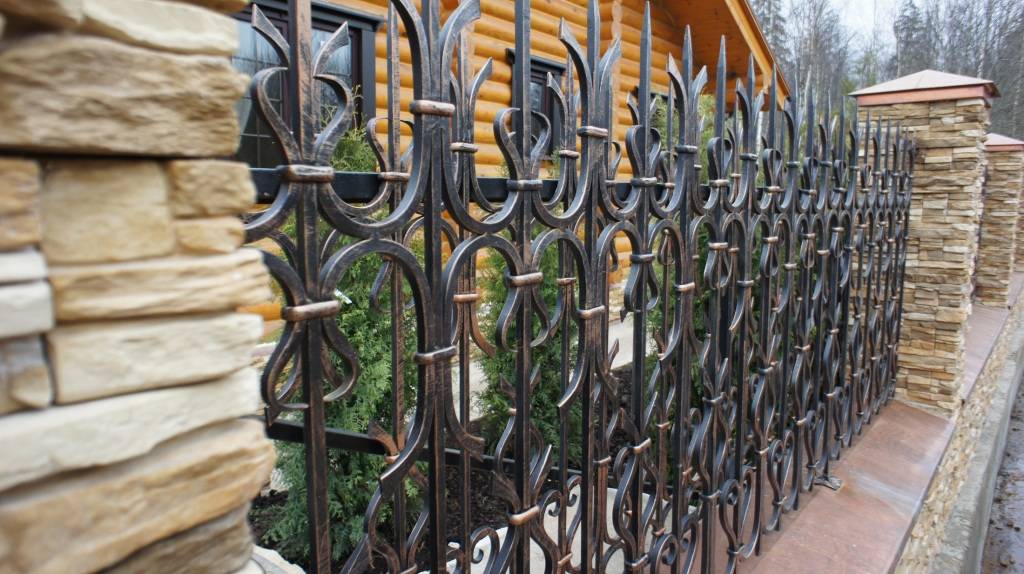 Богатый выбор стилей оформления. Для установки бюджетных оград покупают готовые секции. Чтобы получить неповторимое сооружение, следует разработать свой эскиз и заказать ковку у мастера.