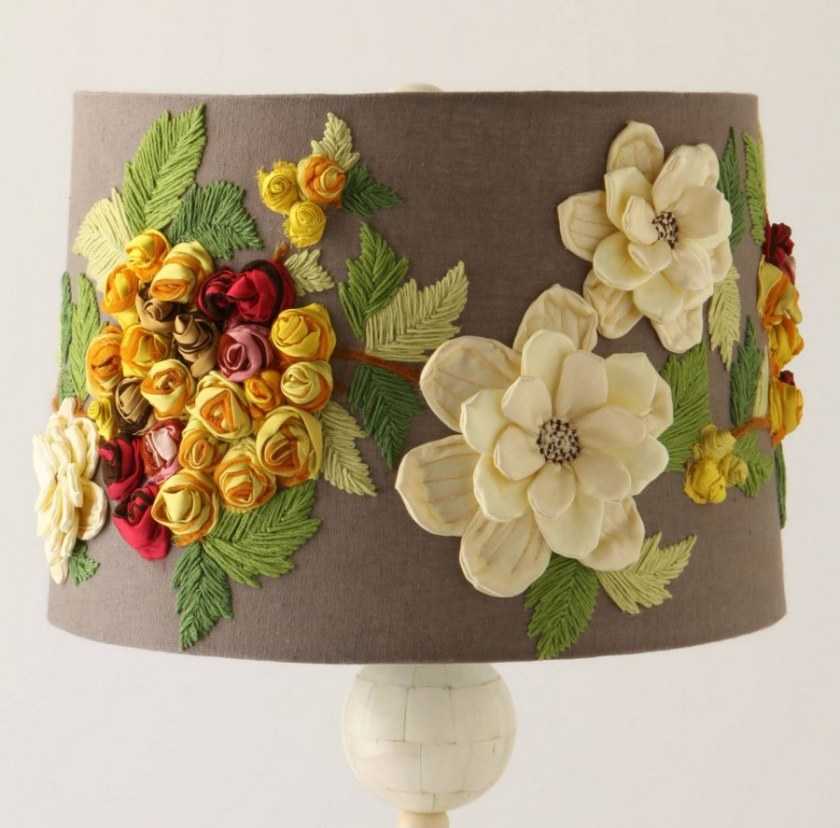Еще одна необычная идея, которая позволит настольной лампе с абажуром стать похожей на клумбу – украшение цветами из ткани.