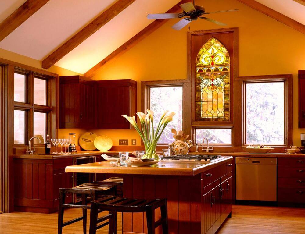 Даже на кухне должна быть гармония, витраж должен сочетаться с кухонной мебелью, отделкой и другими предметами декора.