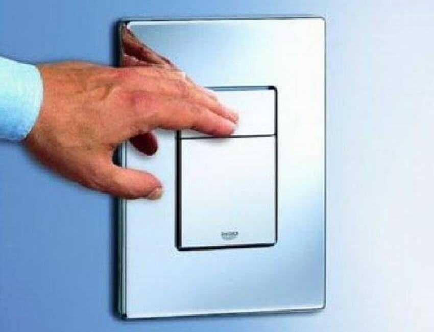 Устанавливаем кнопку слива воды. Она продаётся отдельно и стоит довольно дорого. Лучше выбрать пневматику. Кнопочный блок будет находиться поверх кафельной плитки, поэтому в плитке надо вырезать соответствующее прямоугольное отверстие. Потом необходимо подсоединить к кнопочному блоку две трубки для малого и для большого слива, а далее кнопка защёлкивается в посадочное отверстие.