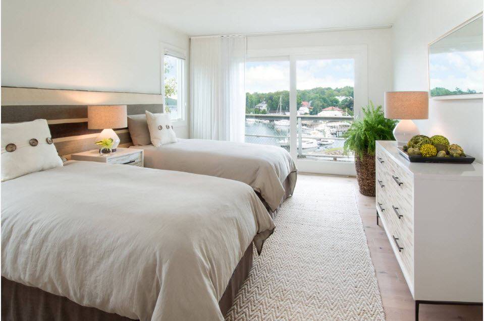 Кровати с одинаковыми тумбочками или постельными принадлежностями отлично дополнят интерьер.