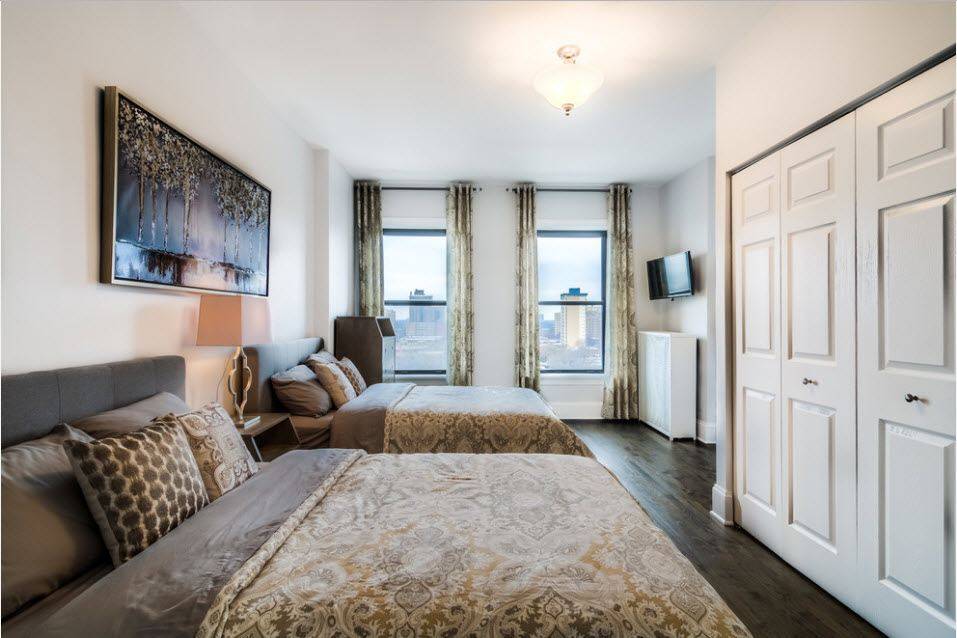 Во втором случае остается достаточно свободного пространства для другой мебели, но для двуспальной кровати здесь важно оставить проход с обеих сторон – по 80 см с каждой будет достаточно. Если для вас не проблема перелезть через соседа, то можно оставить проход лишь с одной стороны