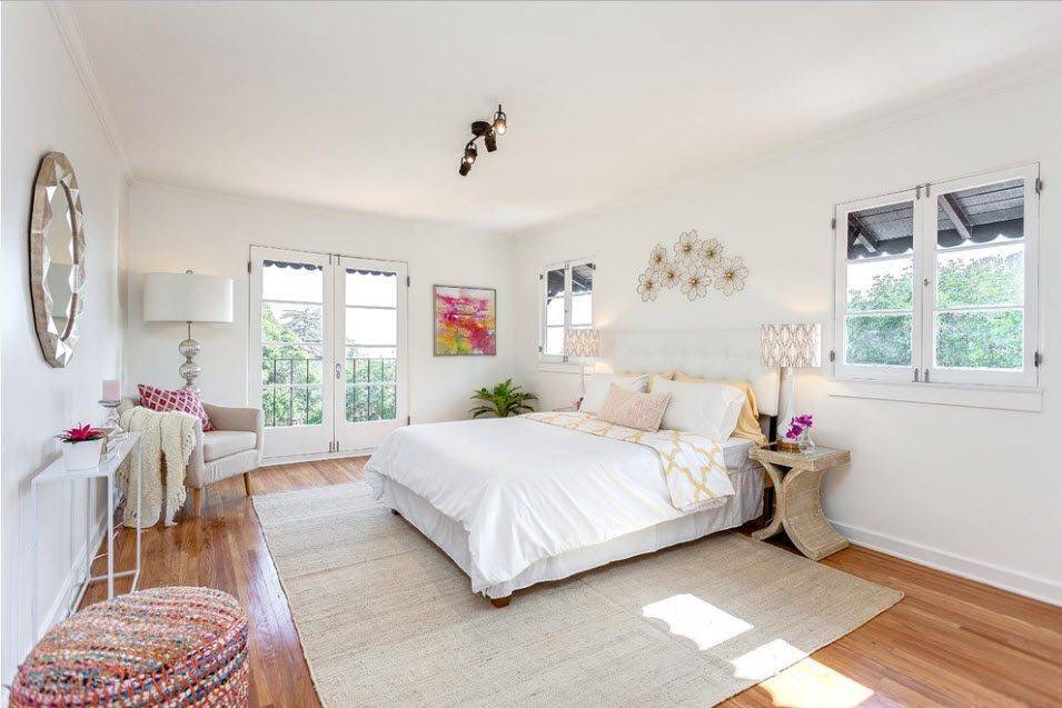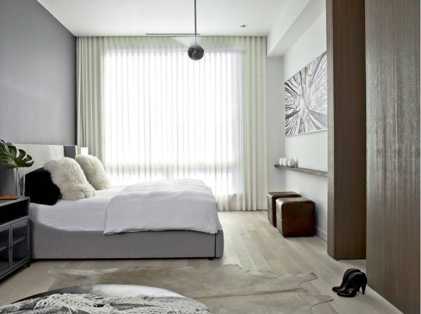Интерьер узкой спальни как будто сам предлагает поделить ее на два небольших помещения. Этого не обязательно добиваться путем строительства стены. Достаточно знать приемы зонирования, разделив спальню на несколько функциональных зон.
