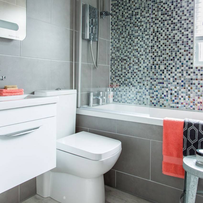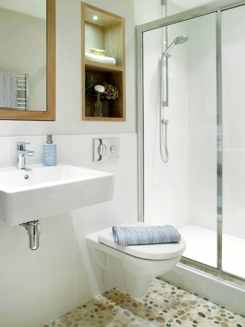 Что касается унитаза — рассмотрите современные модели со скрытым бачком. Либо, как мы уже говорили, установите стеллаж позади классической вариации.