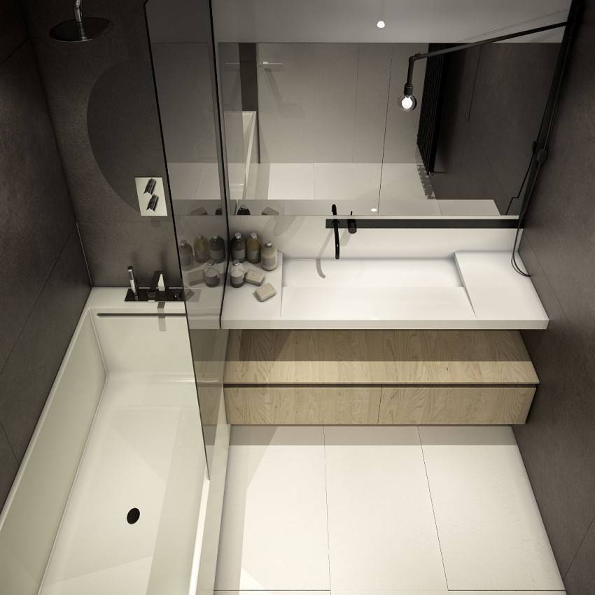 Учитывая маленькую площадь, стоит отдать предпочтение компактным моделям четкой прямоугольной либо асимметрично-треугольной формы. Если позволяет ширина, в нишу возле короткой стены можно поставить ванну (параллельно к этой стене), если нет — обустроить душевую кабинку или поставить унитаз. Иногда данный участок разбивают на две зоны — одну часть занимает ванна, размещенная вдоль длинной стены, другую — развернутый к ней шкафчик, а затем раковина.