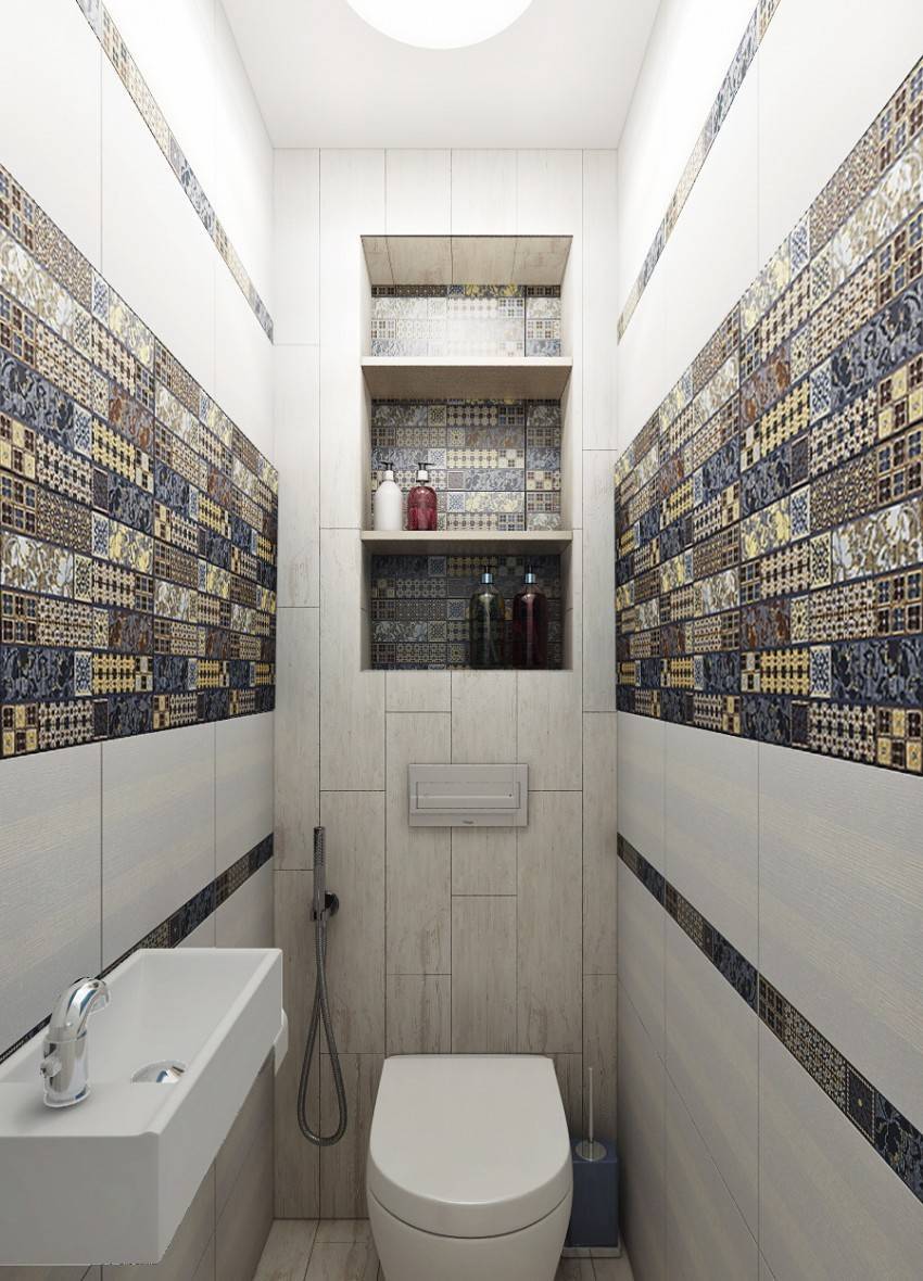 Если необходимо зонировать помещение — укладывайте плитку близких оттенков, но разных размеров. Этот вариант в узкой ванной выглядит лучше, чем контрастные цвета.