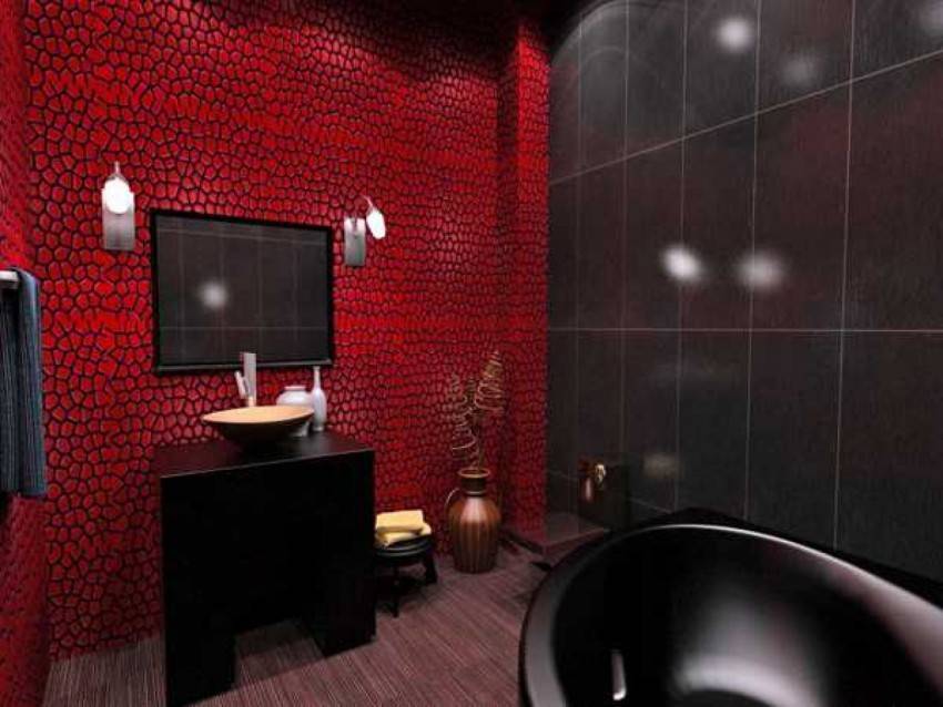 Вариантов отделочных материалов множество: керамическая плитка, панели ПВХ, обои (их лучше клеить дальше от мокрой зоны). Декоративный камень и кирпич менее популярны, но не менее интересны. При выборе кафеля опирайтесь на размер комнаты: чем он меньше, тем мельче плитка. Фотообои с перспективой прекрасно расширяют границы, клейте их на одну из длинных сторон.
