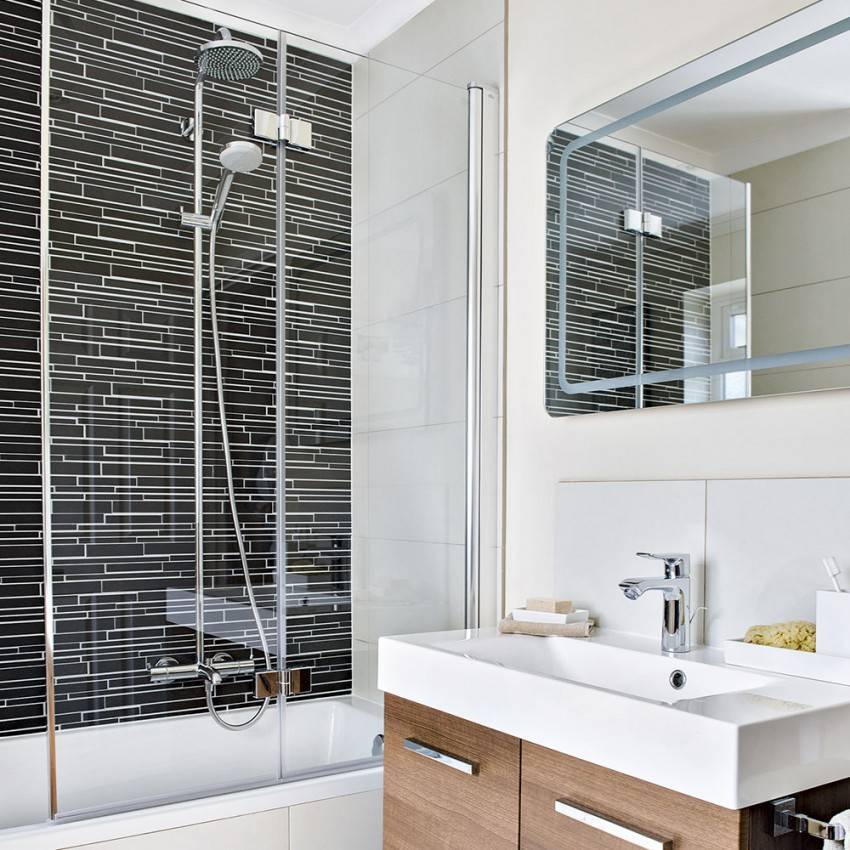 Подвесной умывальник освободит место для небольшой тумбы или стиральной машины, унитаз со скрытым в стене бачком будет смотреться аккуратно и незаметно, а ровную боковую панель ванны можно дополнить удобной откидной полкой.