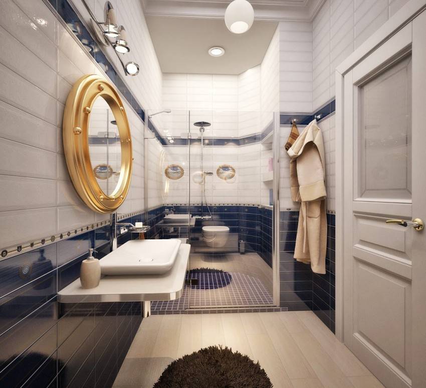Присутствие в цветовой гамме синего и белого оттенков интуитивно напомнит о побережье, релаксации, приятных эмоциях. Хотя не все так однозначно. И любители креатива способны создать ощущение близости океана, воспроизвести в ванной комнате интерьер яхты. В этом случае для отделки пола используется массив тикового дерева , стены покрываются шпонированными панелями, зеркала оформляются в виде иллюминаторов.