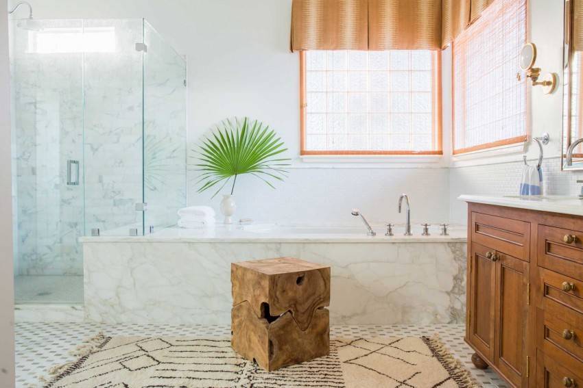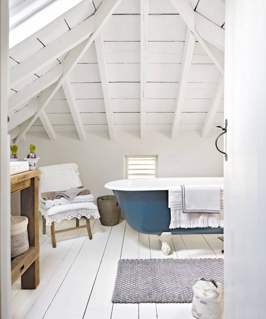 Деревянные балки на потолке позволят создать дух средиземноморья в ванной