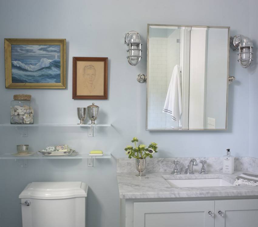 Натуральные мягкие и нейтральные цвета с голубыми оттенками характерны для морского стиля. Стены оформляют в бежевых и песочных тонах, это придает теплоты, на стенах также можно разместить элементы из ракушек. Такой дизайн хорошо сочетается с викторианскими мотивами
