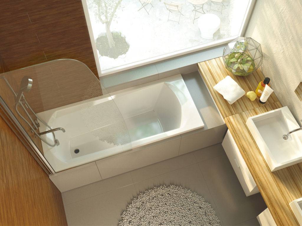 Более удачный вариант – монтаж компактной ванны (сидячей), длина которой не превышает 1200 мм. Чаще всего такую сантехнику закрывают перегородками, обеспечивая комфортное пребывание в комнате. Сидячую модель устанавливают даже в совмещенный санузел, чтобы объединить все необходимые функции в одном пространстве.