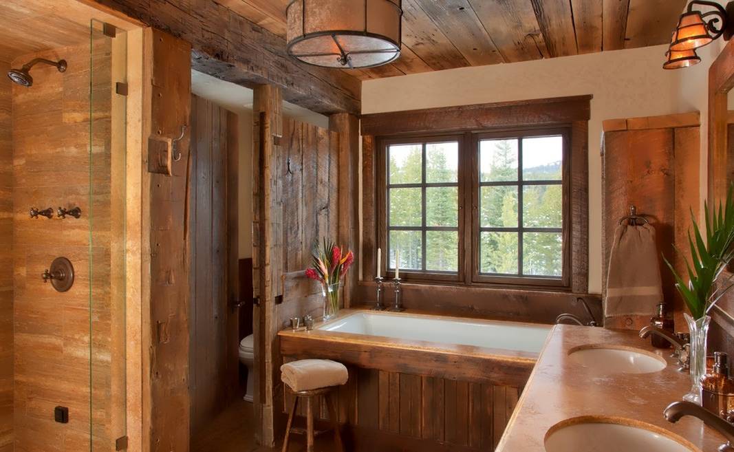 В загородном доме прекрасно смотрится ванна декорированная деревом. Для этого используется обработанная защитной пропиткой древесина лиственницы или кедра. Большая угловая ванна или джакузи подойдет счастливым обладателям большого помещения для водных процедур. А для миниатюрной ванной комнаты лучше выбрать душевую кабину.