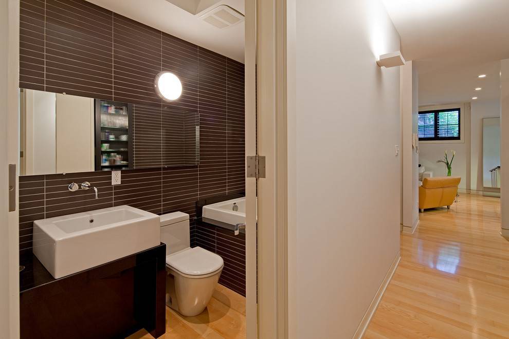 Сочетание коричневой плитки в ванной и туалете