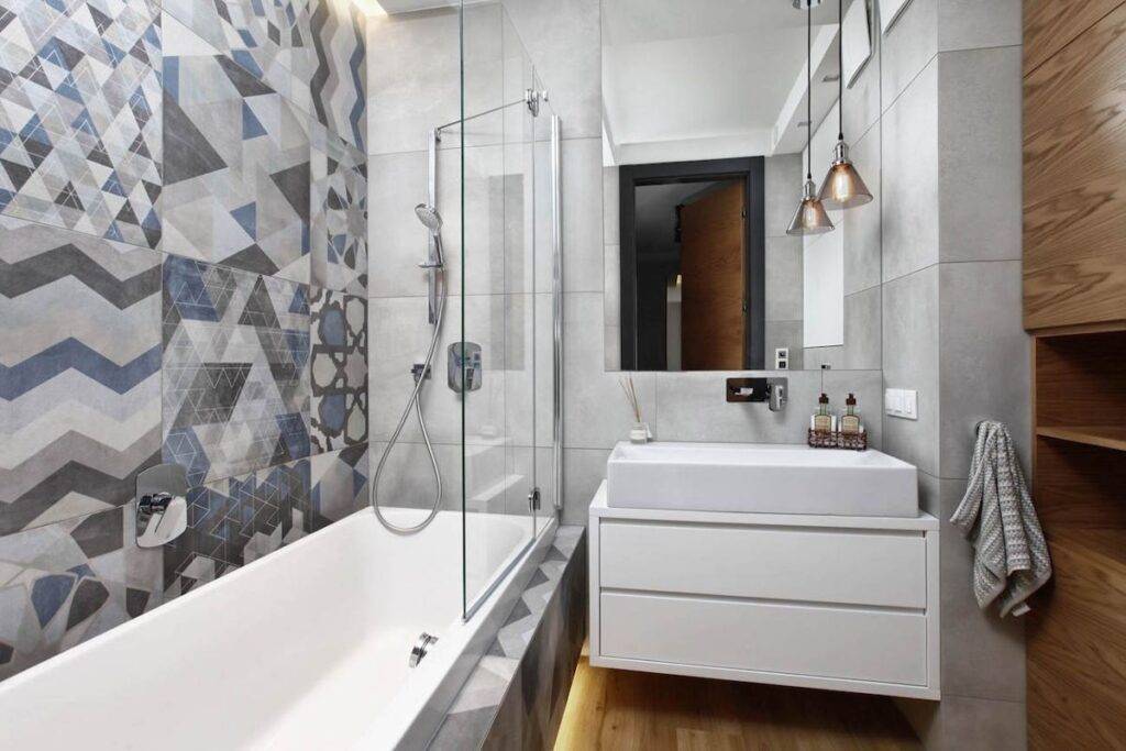 Чтобы избежать однообразия, вы можете подобрать плитку для ванной комнаты не только разных цветов, но и разных фактур и размеров. На некоторые стены можно укладывать плитку крупной плиткой, мозаикой и даже красить плитку небольшого размера.