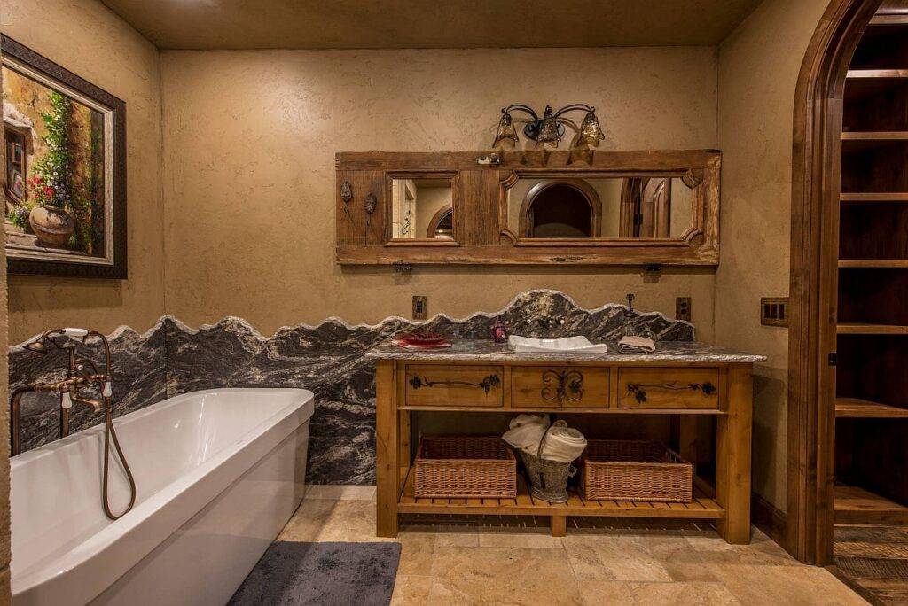 Модели с имитацией камня привлекают внимания и создают нестандартный и яркий интерьер. Такие варианты имеют стильный внешний вид. Однако ванная комната, отделанная под камень, всегда будет смотреться холодно, поэтому лучше выбрать теплое освещение и дополнить интерьер уютными и нежными элементами.