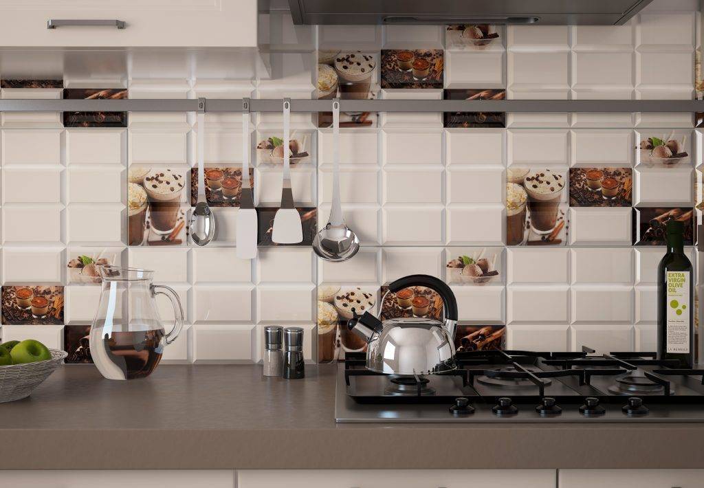 Как правило, расположен такой кафель над плитой, у вытяжки, над столешницей. Такая отделка рабочей зоны смотрится эффектно, и на ней менее заметны следы, которые остаются после приготовления пищи.