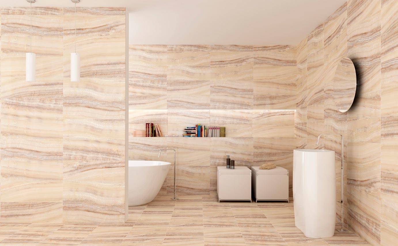 Бежевые оттенки позволяют зрительно увеличить площадь помещения, создают фон для орнаментов, коллажей. В ванной комнате можно сочетать мраморные блоки разных золотистых оттенков. С помощью песочной гаммы оттенков можно реализовать укладку «шахматкой» на полу, создать акценты на стенах.