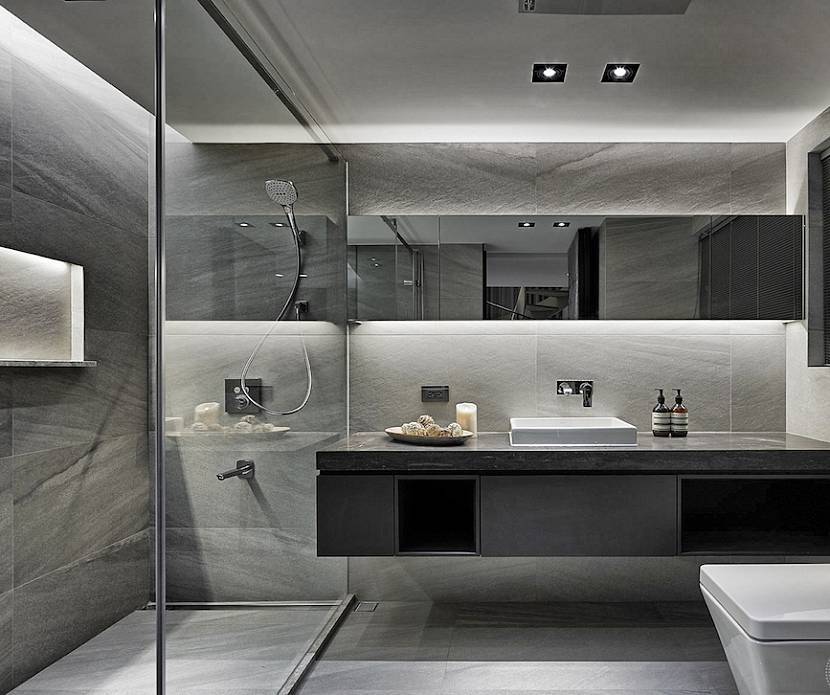 При реализации проекта ванной комнаты с мраморной плиткой в минималистическом стиле возможна отделка стены либо пола. Рекомендовано использовать нейтральные сочетания черного, белого цветов