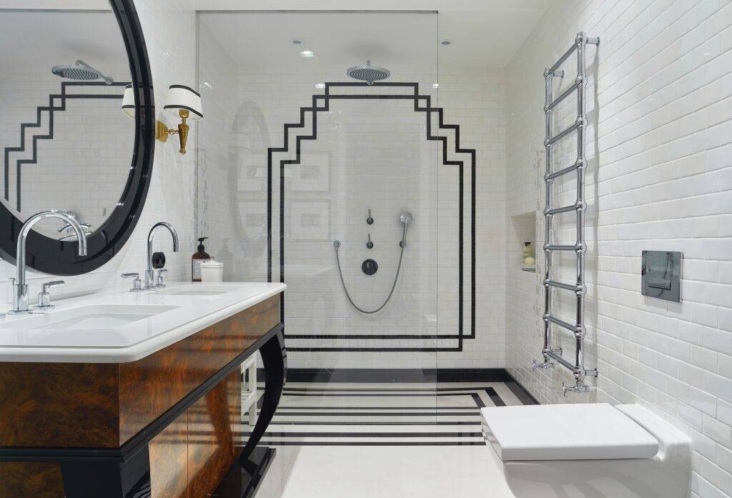 Зеркало часто выступает акцентом, имея богатую раму или необычную форму. Открытые полки оформляются минималистично и применяются только для аксессуаров, подчеркивающих роскошный стиль: красивых ваз, стеклянных флаконов. Большинство предметов гигиены хранятся за дверцами встроенных шкафов и не нарушают гармонию обстановки.