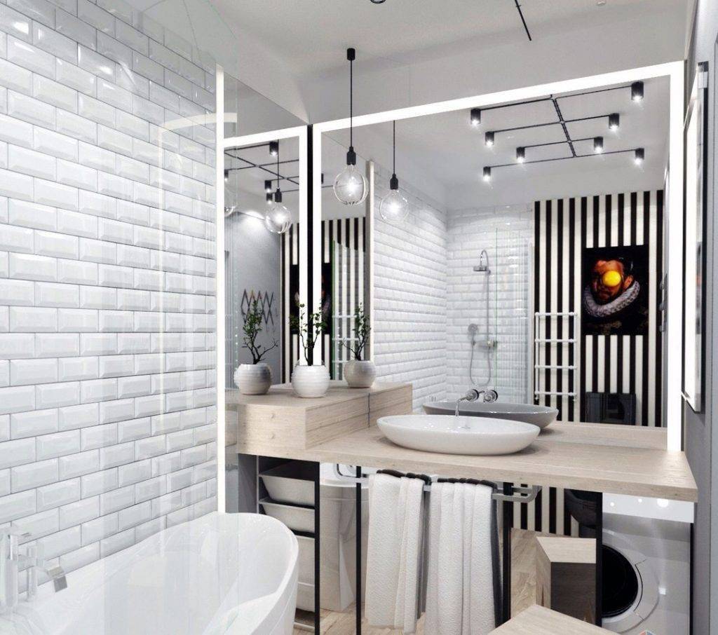 Наиболее распространённым вариантом отделки маленькой ванной комнаты в скандинавском стиле считается совмещённый санузел