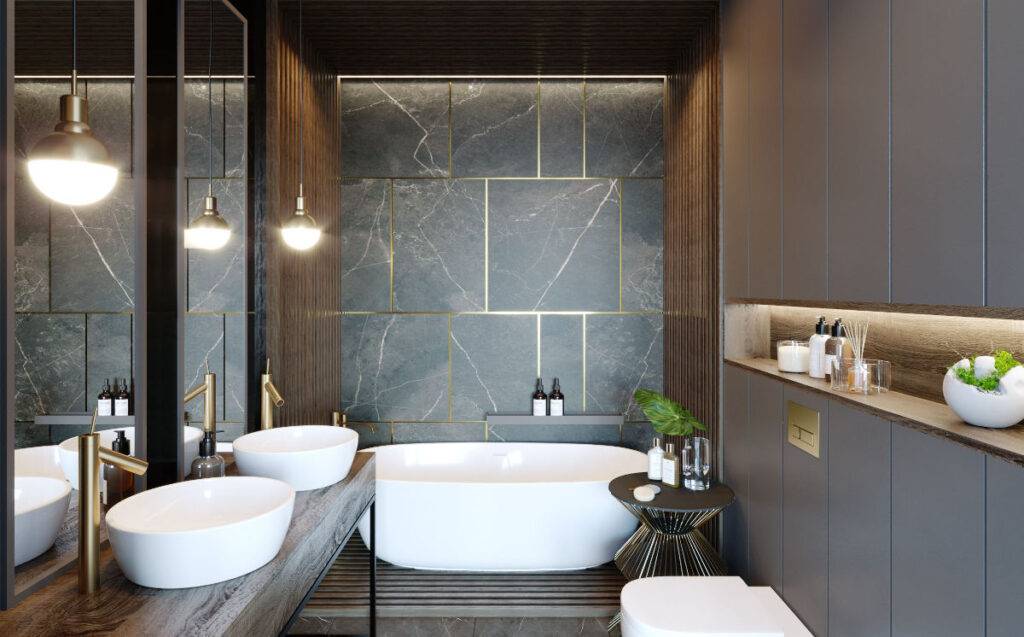 Поверхности в ванной часто соприкасаются с водой, а также попадают под воздействие высоких температур. В связи с этим отделочные материалы подбираются с учетом их характеристик и только после — визуальных качеств.
