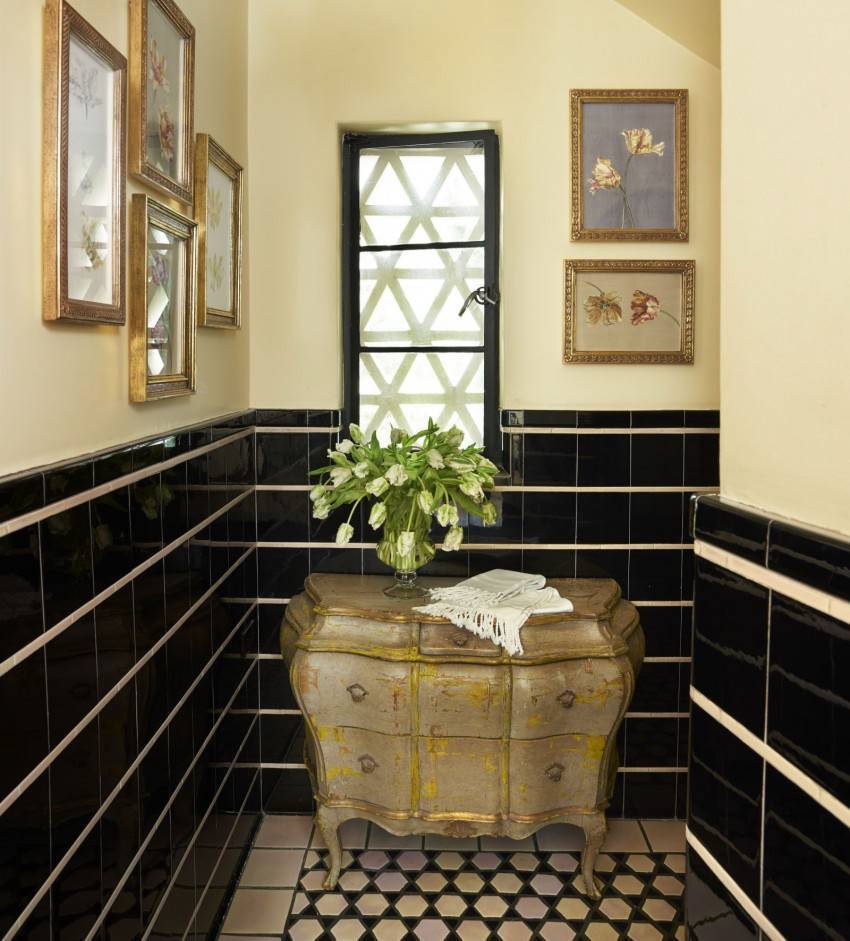 Важную роль в гармонизации черно-белого оформления помещения играет сочетание пол – потолок. В большинстве интерьеров для пола выбирается матовая однотонная плитка, которую можно выложить любым геометрическим рисунком или классически – в шахматном порядке. А диагональная выкладка плитки на полу является еще одним способом визуального расширения пространства.