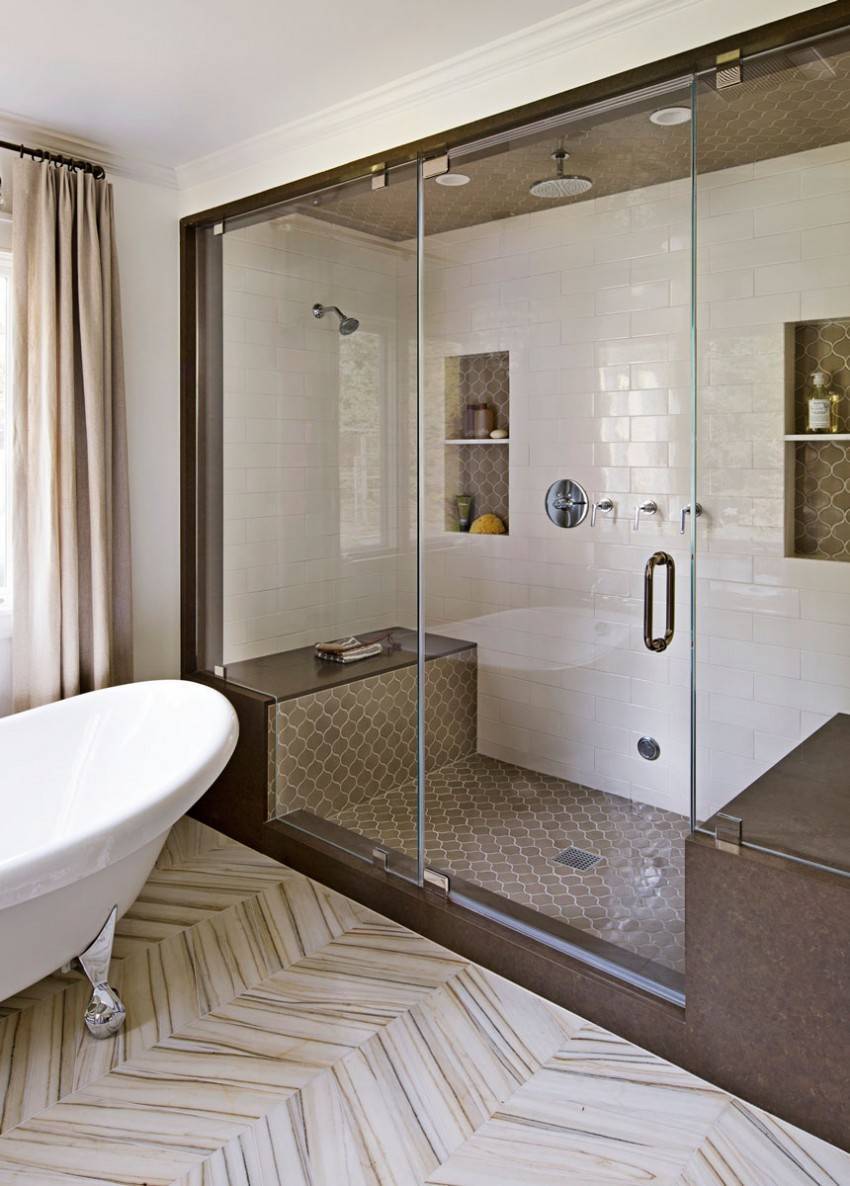 Для гармонии и баланса вы можете отказаться от душевого поддона и поставить душевую кабину прямо на кафельный пол. Также нужно помнить, что пол в этом месте должен создавать уклон, отводящий воду в канализацию.