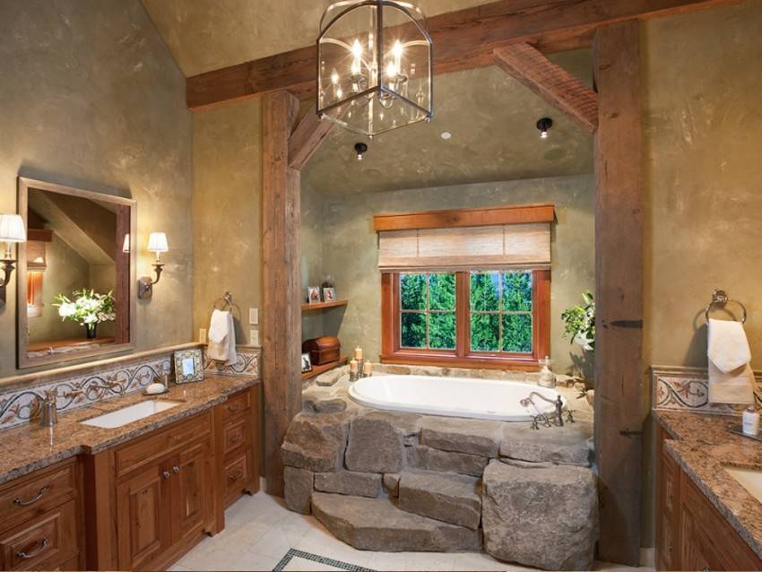 Чудесным украшением станет для такой ванной кованая люстра с металлическим или деревянным абажуром. Она же обеспечит и освещение в комнате, которое в данном случае должно быть средней яркости.