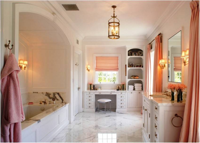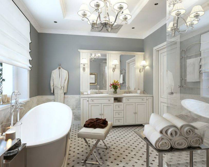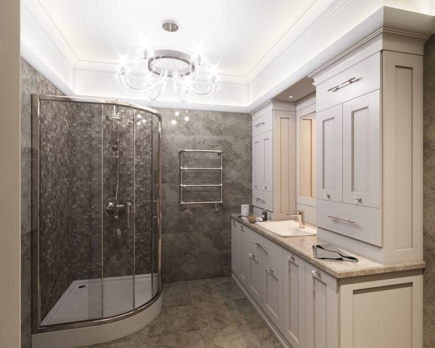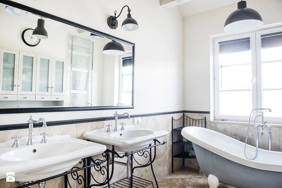 Если желание выполнить ванную в данном стиле есть, а окна нет или оно слишком маленькое, то придется компенсировать этот недостаток за счет источников искусственного света.
