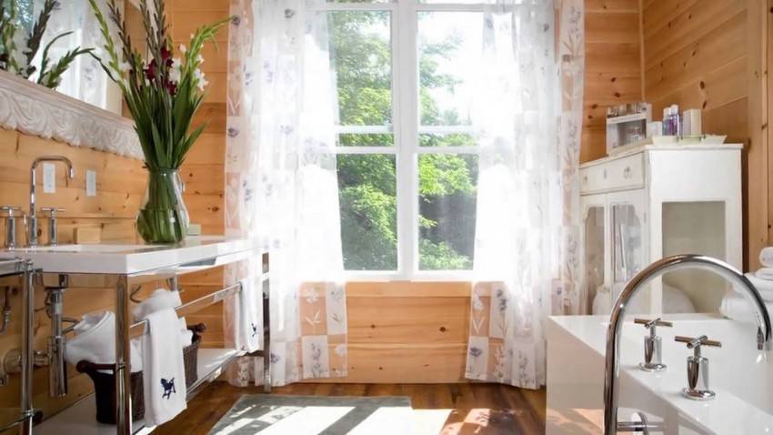 Не стоит оклеивать стены плиткой с крупным и броским цветочным принтом – от этого теряется необходимая атмосфера. В качестве отделки можно использовать влагостойкие обои либо водно-дисперсионную покраску. Если хочется использовать пластиковые панели, необходимо подбирать принт и фактуру максимально точно. Недопустимо наличие глянца, древесина может быть передана за счет качественной печати. Кроме того, можно отделать часть стены возле ванны мрамором.