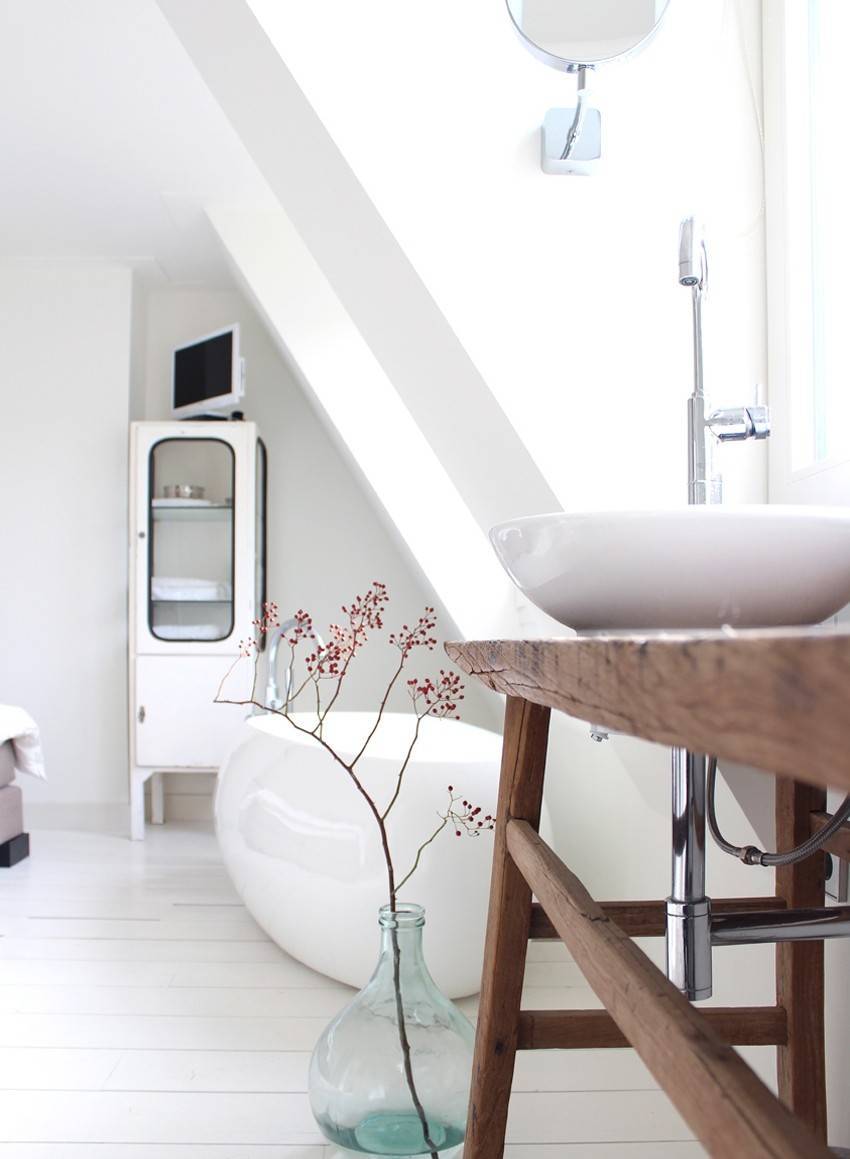 Сложности могут возникнуть также при отделке ванной комнаты, которая расположена в мансарде частного дома. Наклонный скат крыши сужает пространство и ограничивает возможности для дизайна. Зато при наличии мансардного окна размещение под ним ванны позволяет превратить санузел из чисто утилитарного помещения в место для релаксации и медитации «под открытым небом».