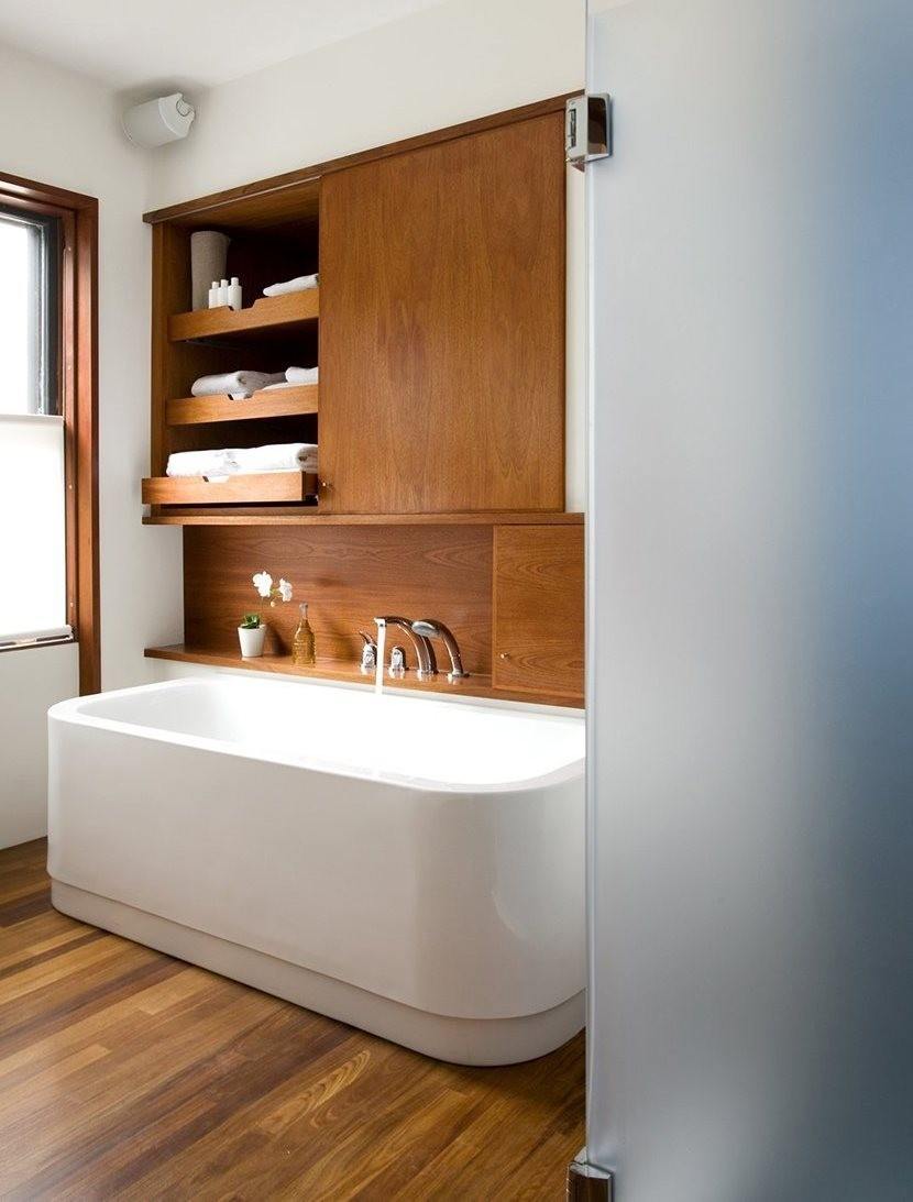 В современных интерьерах особенно маленьких ванных комнат широко используется функциональная мебель со скрытыми шкафчиками и нишами, в которые удобно прятать всякие бытовые мелочи.