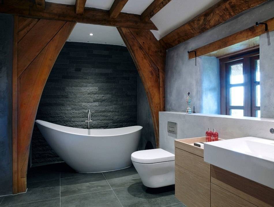 Современный интерьер ванной предполагает использование натуральных материалов, а именной обилие бетонных, каменных и деревянных элементов в дизайне помещения.