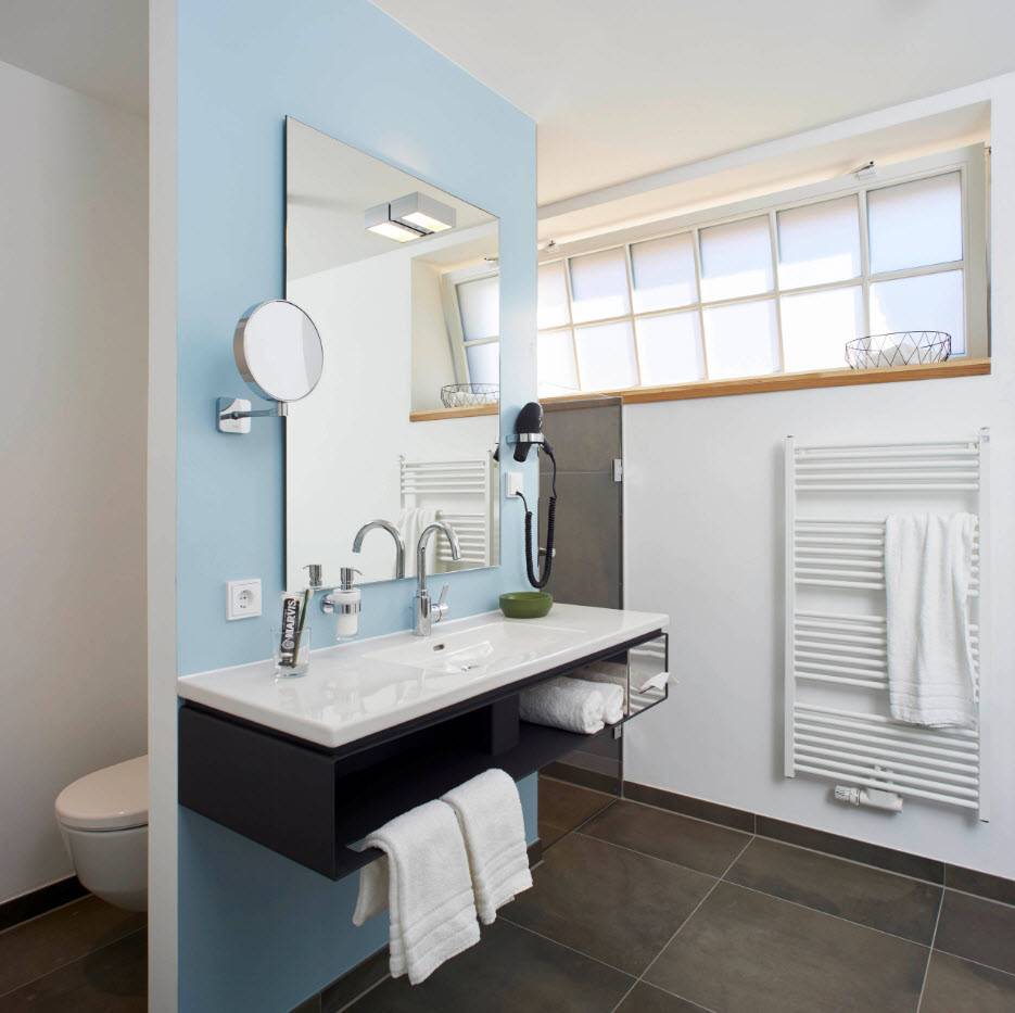 Настенный монтаж на половину высоты создает пространство для предметом гигиены, представляя собой полку. Монтажные блоки имеют глубину от 17 до 25 сантиметров, их высота меняется по мере необходимости. Настенная проекция может быть сразу использована в качестве опции для хранения. Если в полостях стенового элемента отсутствуют технологии и трубы, это пространство идеально подходит для скрытых полок.