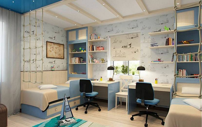 Если комнату делит мальчик и девочка, можно пространство делить перегородкой и каждую половинку оформлять по-своему, но с одинаковым набором мебели. Когда пространство маленькое, разграничение пространства производится цветом.