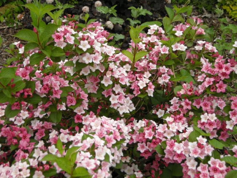 Вот такие смешанные композиции, в которых сочетаются, например, кизильники, низкорослые барбарисы, спиреи, хвойные растения – можжевельники и кипарисы – с вейгелой радуют глаз и приносят желанное чувство покоя. Но даже высаженные одиночные кустарники вейгелы смотрятся не менее красиво у калитки либо у парадного входа.