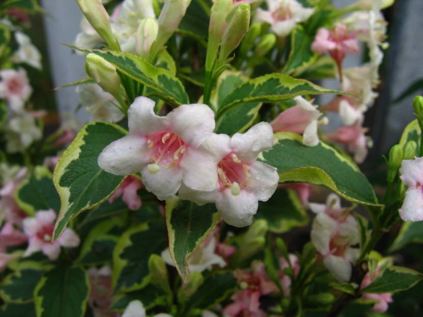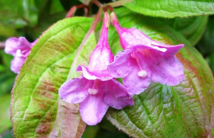 - Вейгела розовая (Weigela florida Bunge). Наружная поверхность цветков карминно-розовая, а внутренняя — практически белая.